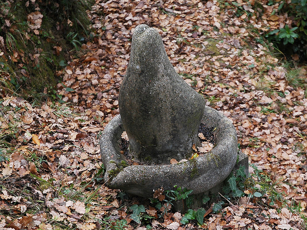 Títol explícit d' aquesta escultura-font amb un raig d' aigua que cau en dos vasos que, per la seva forma, recorden una curculla,clova o petxina.